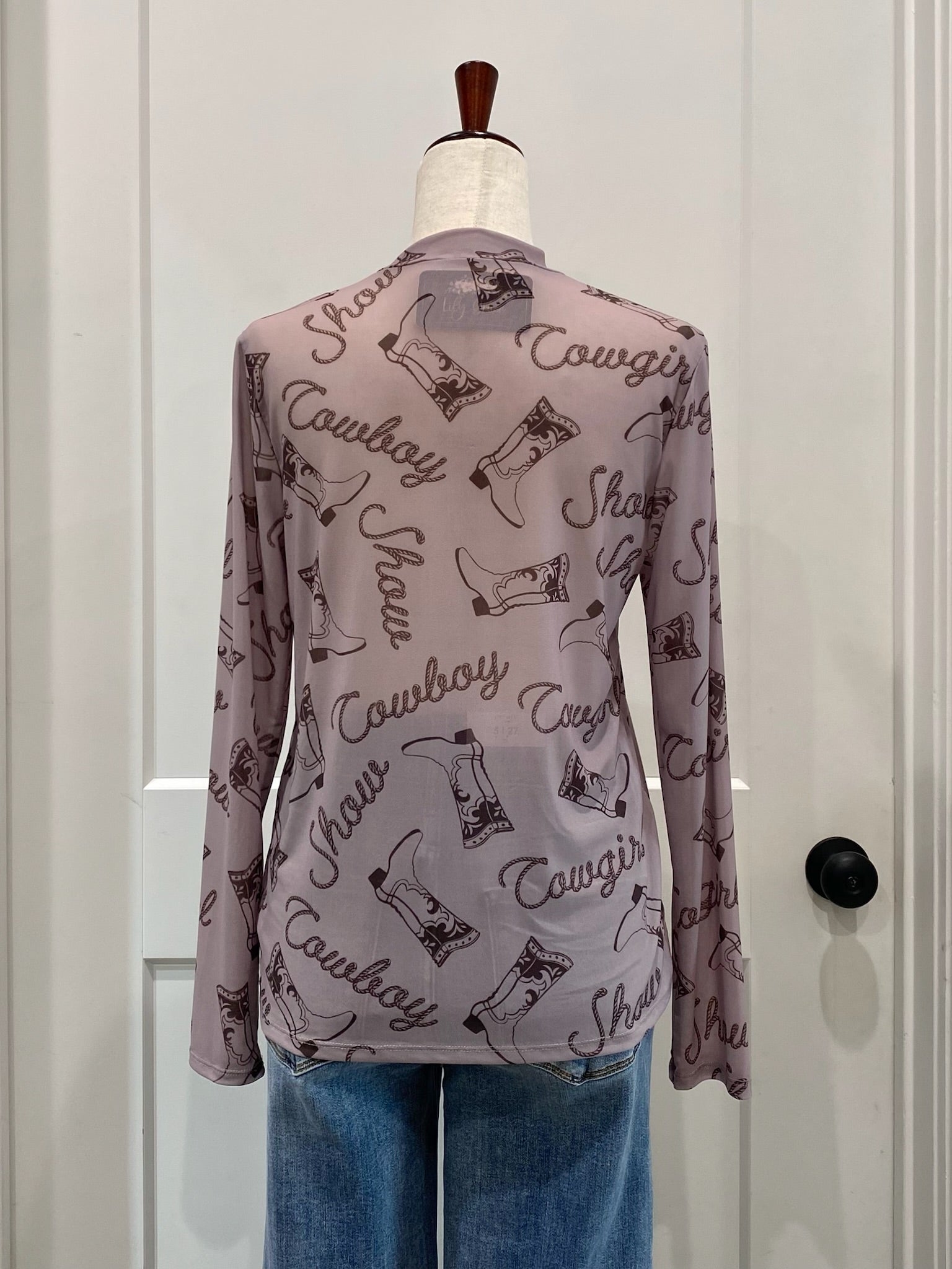 Experience the perfect blend of style and comfort with the Cowboy Show Mesh Top. Crafted from a breathable mesh stretch fabric with 95% polyester and 5% spandex, this sheer long-sleeve top offers effortless flexibility and a flattering fit. The mock neck adds a refined touch, while its lightweight design makes it ideal for layering. Proudly made in the USA, this versatile piece is a sophisticated choice for Western-inspired fashion enthusiasts.