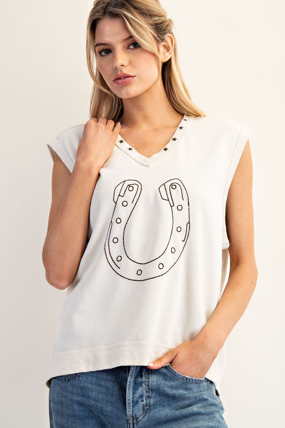 Product Detail: This sleeveless top features a bold horseshoe embroidery at the front, a star studded V-neckline, exaggerated dropped armholes, raw edge detailing, and a relaxed fit for a casually cool, western inspired look.