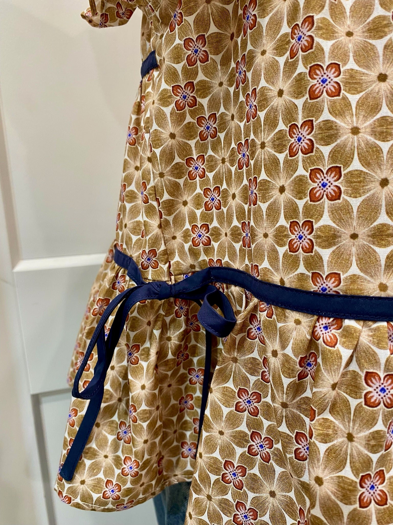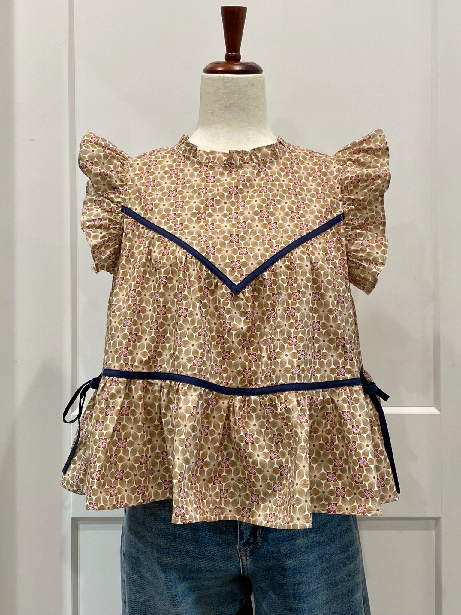 This floral printed top combines delicate details with expert craftsmanship, featuring a ruffled neckline and flutter sleeves for an elegant silhouette. The contrast piping adds refined definition, while the tiered design with a side tie enhances shape and movement. A button and loop closure at the back reveals a subtle keyhole, lending a sweet, feminine touch. Crafted from 100% cotton, it ensures breathable comfort and durability for everyday wear.