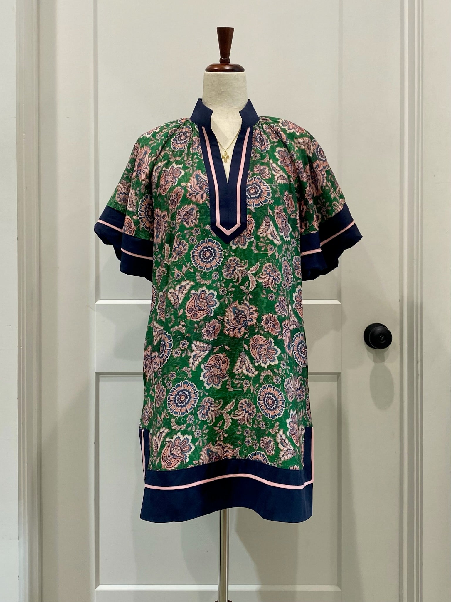 This floral paisley print pullover mini dress combines elegant design with practical comfort. Featuring contrast accent bubble sleeves and hem, its caftan-inspired high neck band adds a refined silhouette. Crafted from a lightweight, woven fabric blend of 85% rayon and 15% nylon, the dress is fully lined and non-sheer for confidence and ease. Side pockets offer convenient functionality, making it a versatile choice for both casual and dressier occasions.