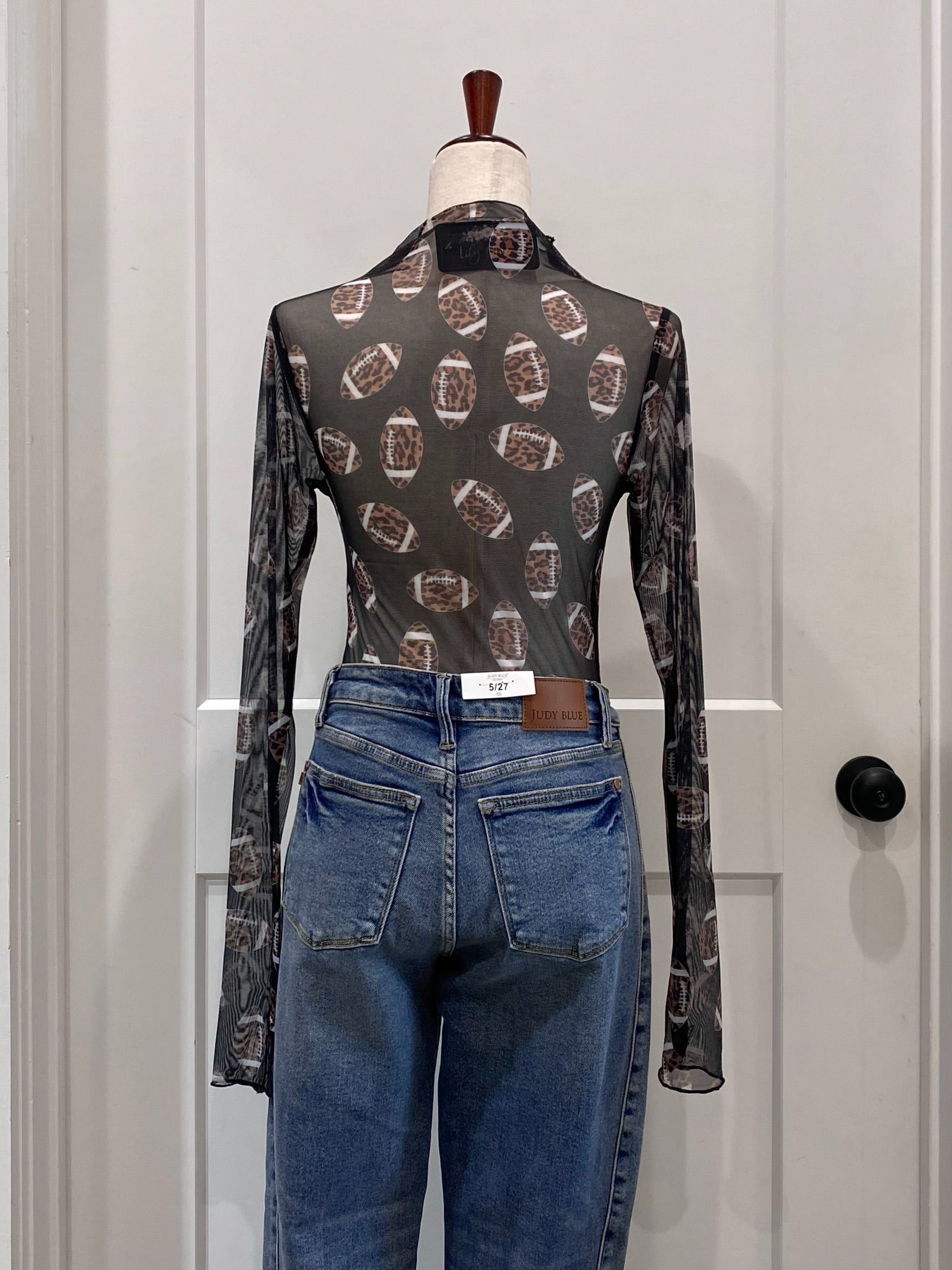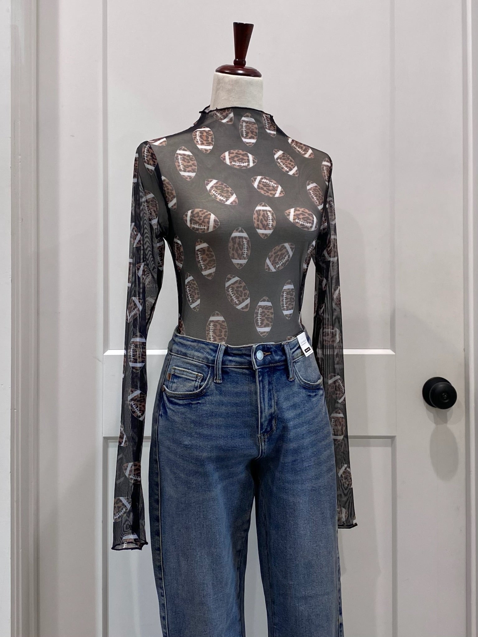 This sheer mesh top combines sporty and playful elements with its fitted silhouette and allover leopard football print. Crafted from a comfortable blend of 92% polyester and 8% spandex, it features raw edge finishes and thumbhole cuffs, making it an ideal layering piece that adds both style and functionality to your wardrobe.