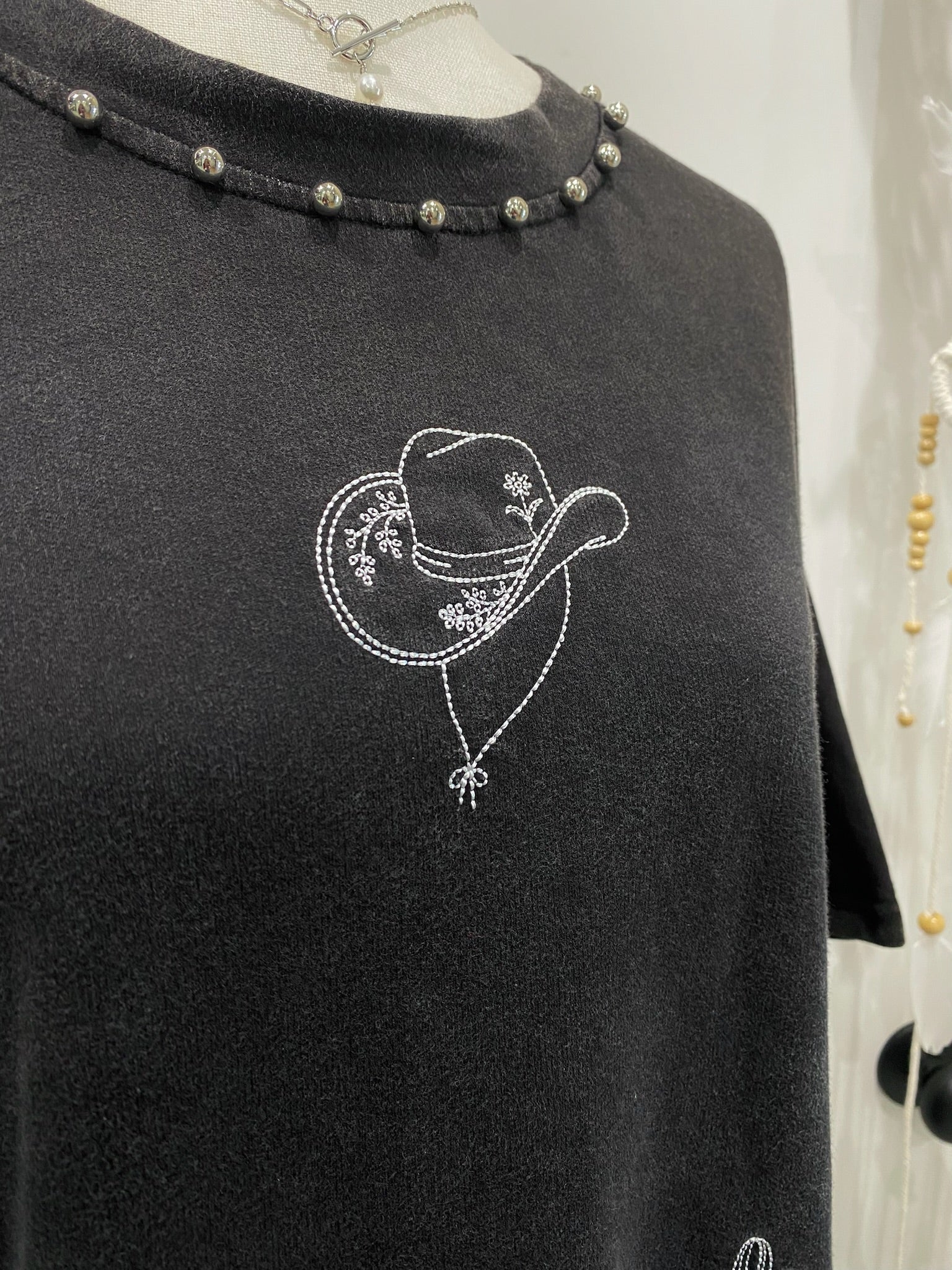 The Western Inspired T-Shirt Dress combines comfort and style in a relaxed silhouette crafted from washed cotton terry. Featuring playful embroidered motifs like cowboy hats, boots, cacti, and horseshoes, it brings rustic Western charm to modern wardrobes. Details such as a studded neckline and side slits enhance movement and subtle edge. This versatile dress layers easily and pairs well with sneakers, sandals, or boots, making it an essential addition to any contemporary womenswear collection.