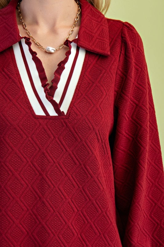 This Textured V-Neck Dress combines sophisticated design with subtle detailing. Crafted from a comfortable blend of 98% polyester and 2% spandex, it offers a flattering stretch and durability. Featuring a sharp collar and ruffled contrasting stripe accents, the dress provides a unique and refined look ideal for both professional and stylish casual settings. The textured fabric adds depth and interest, enhancing the dress’s overall elegance and wearability.