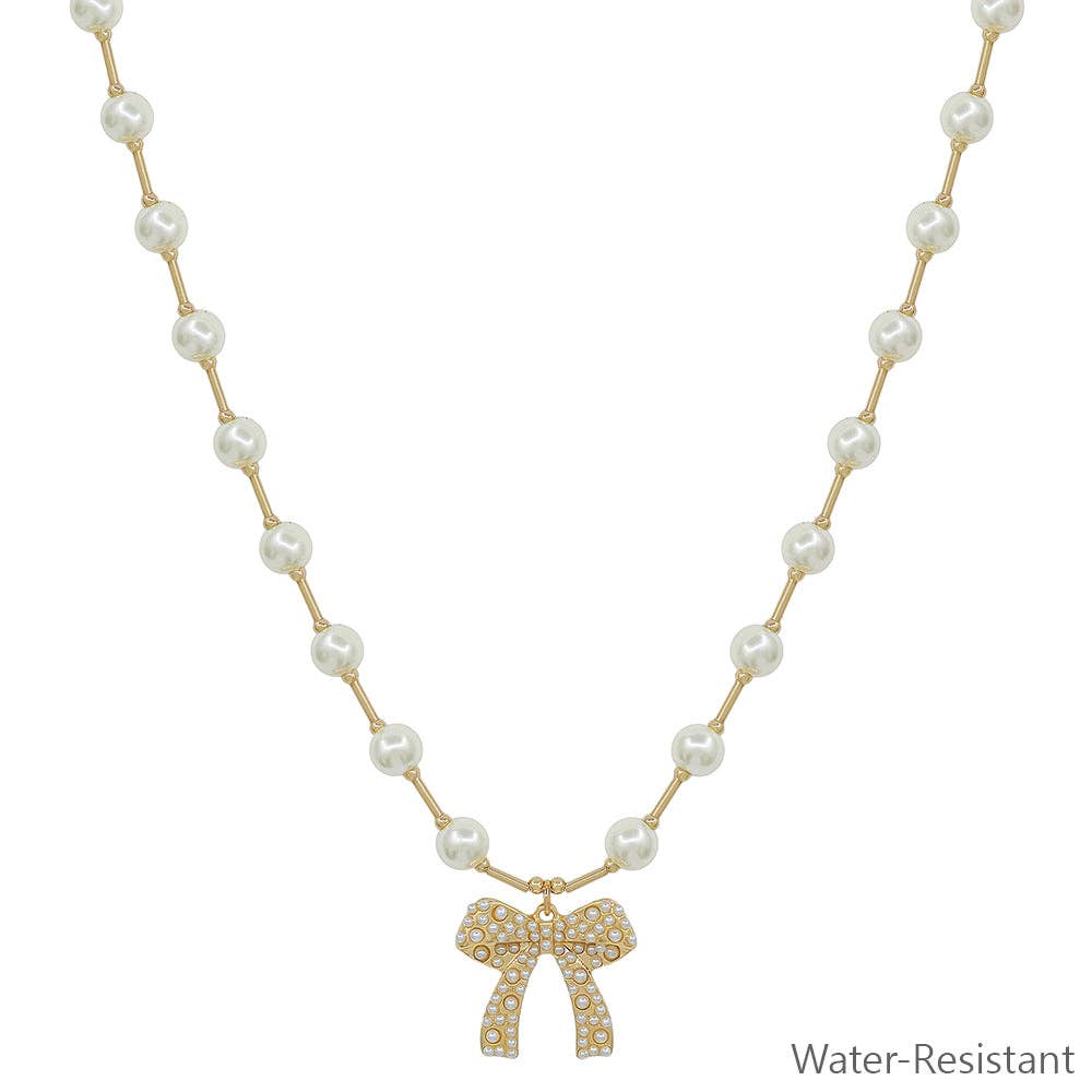 Our Water Resistant 6MM Pearl Beaded Chain with Bow Necklace, adjustable between 16" and 18", combines elegance and durability. Crafted with water-resistant pearls and accented by a delicate bow, it offers both style and resilience for everyday wear. Its versatile length ensures a perfect fit, making it an expert choice for a refined yet practical accessory.